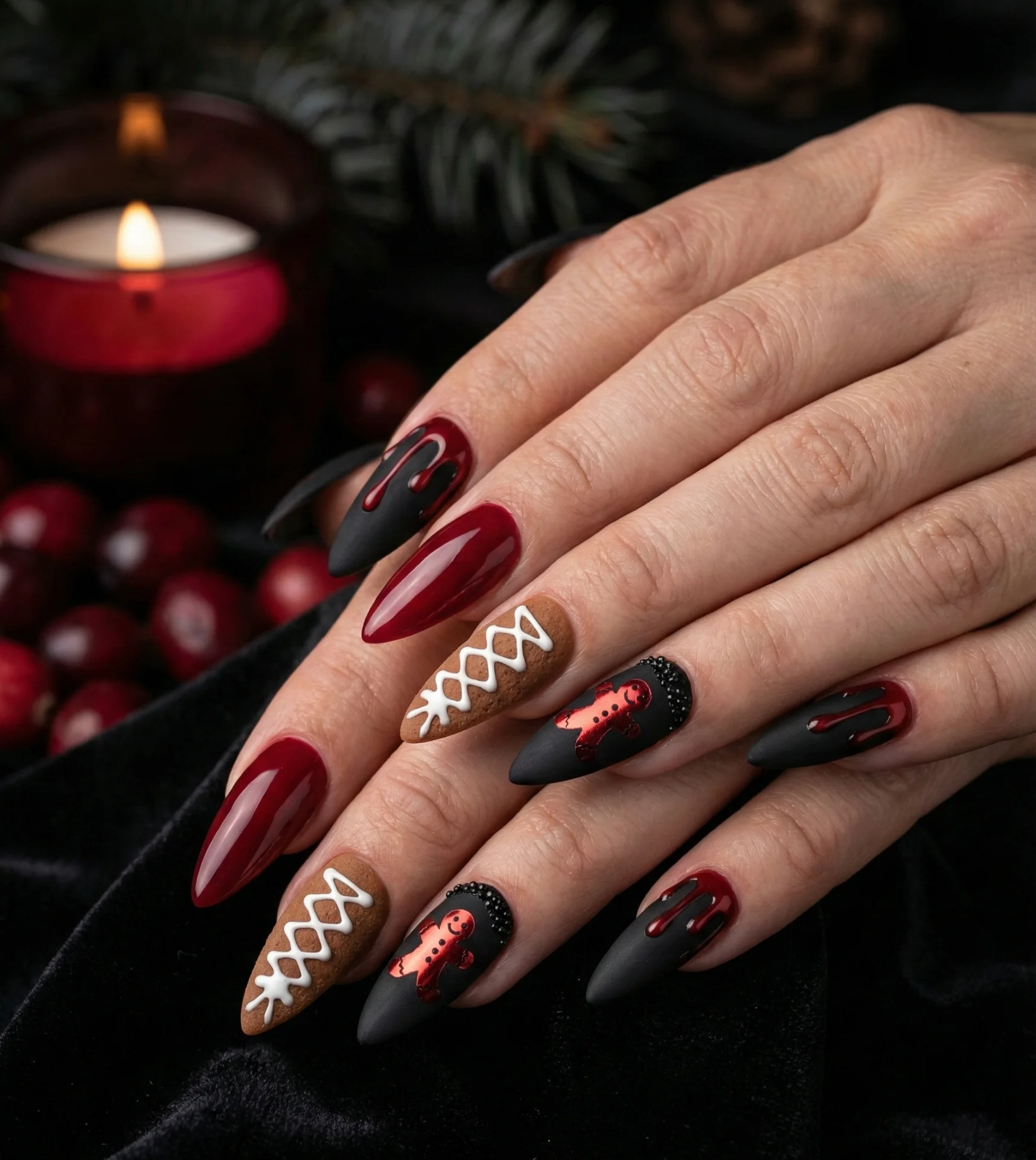 Bold black and red gingerbread nails with edgy Christmas glamour.